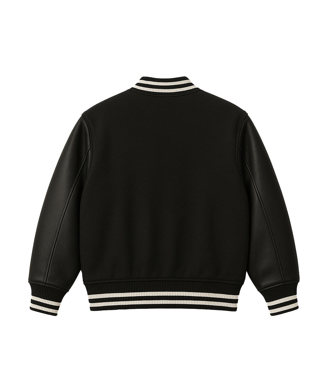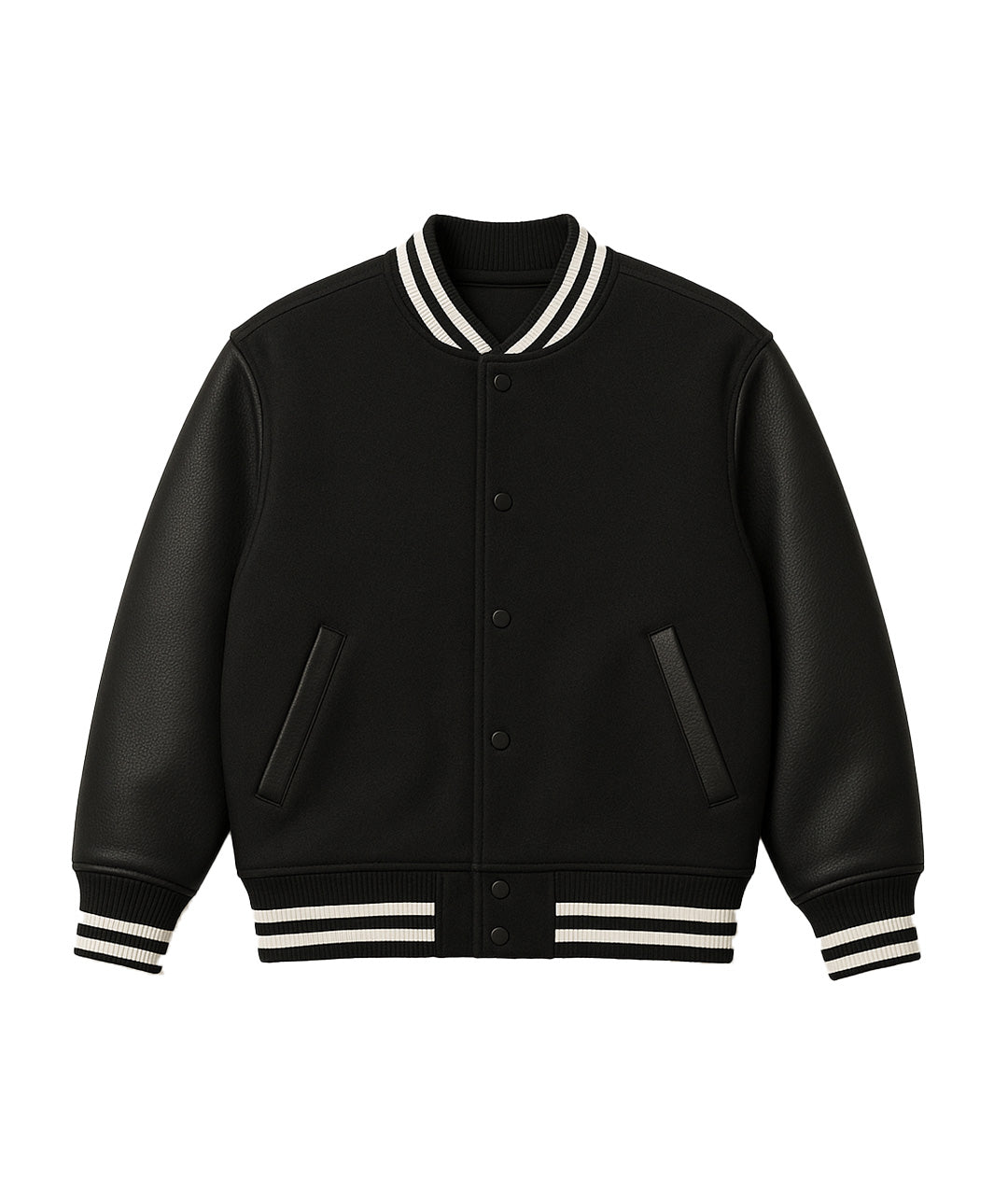 This is the varsity that makes a statement without saying a word. Jet-black fleece meets matte leather sleeves, striking the perfect balance of grit and refinement. Designed in a boxy oversized fit, it feels heavy, structured, and unapologetically premium.