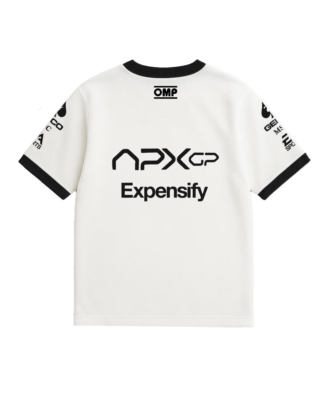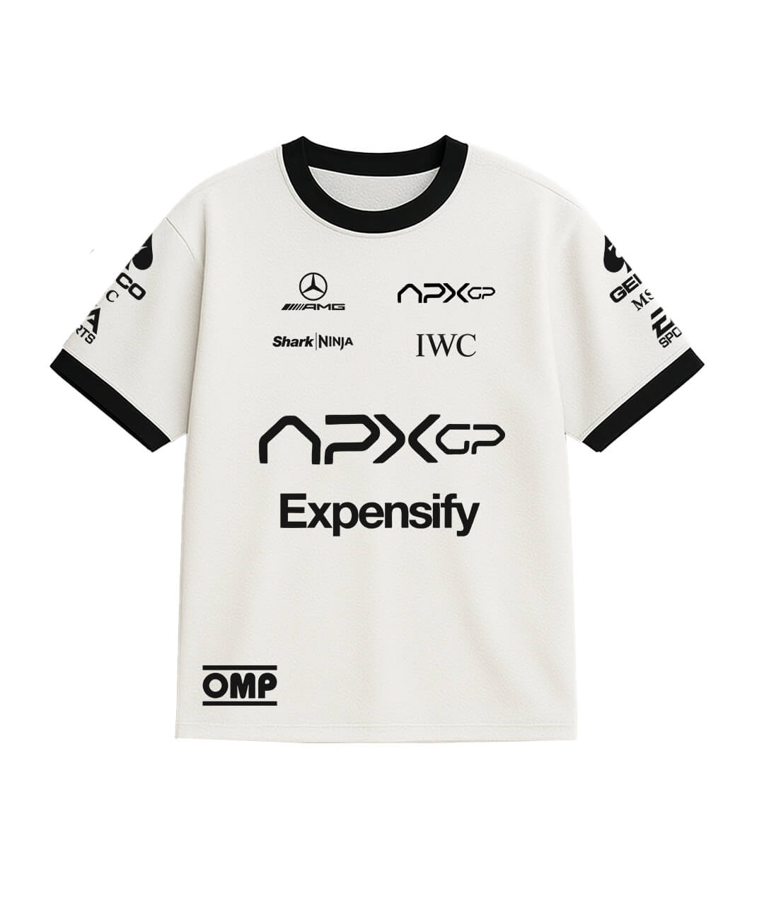 White body with bold Apex GP sponsor prints on chest, back, and sleeves
