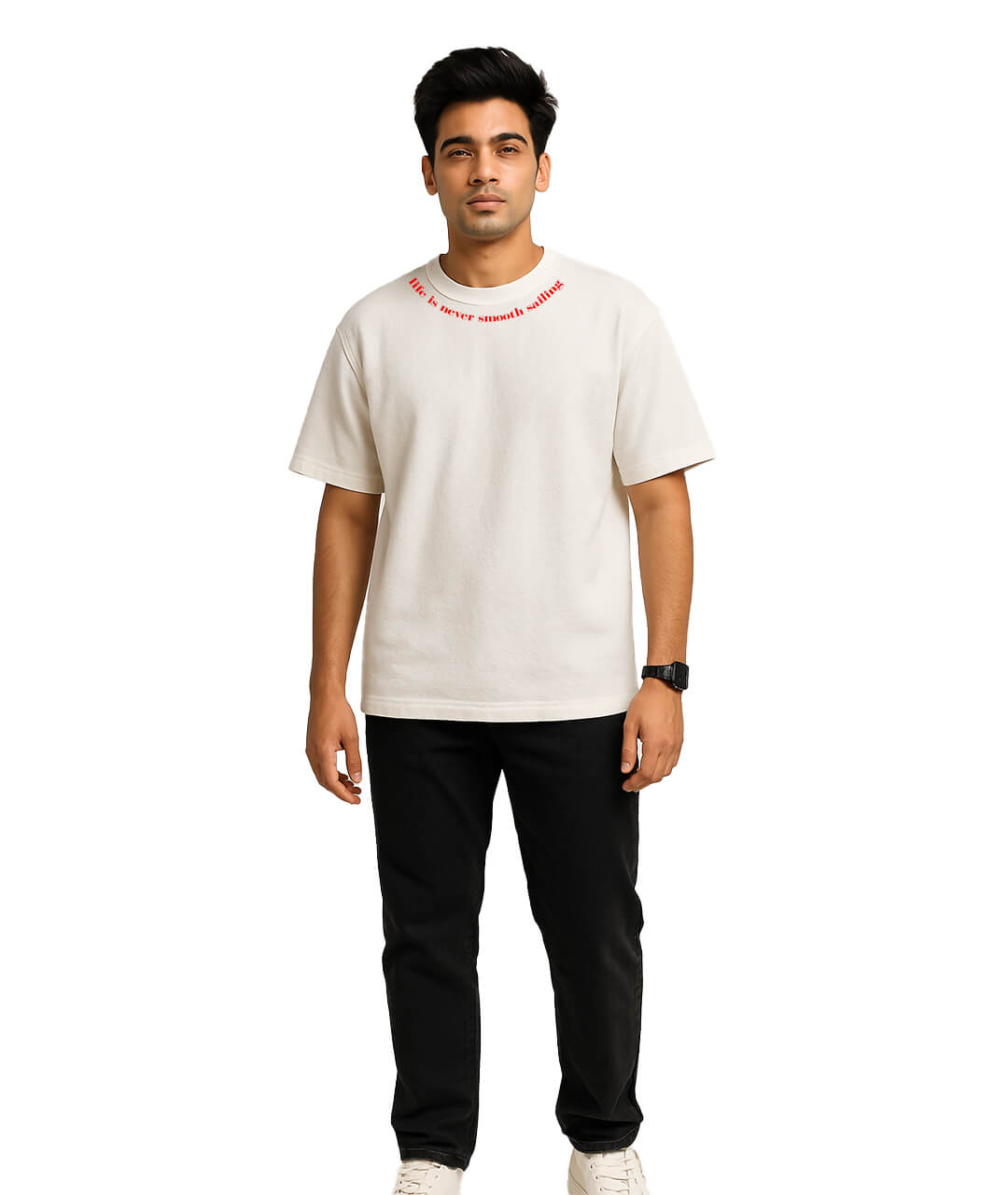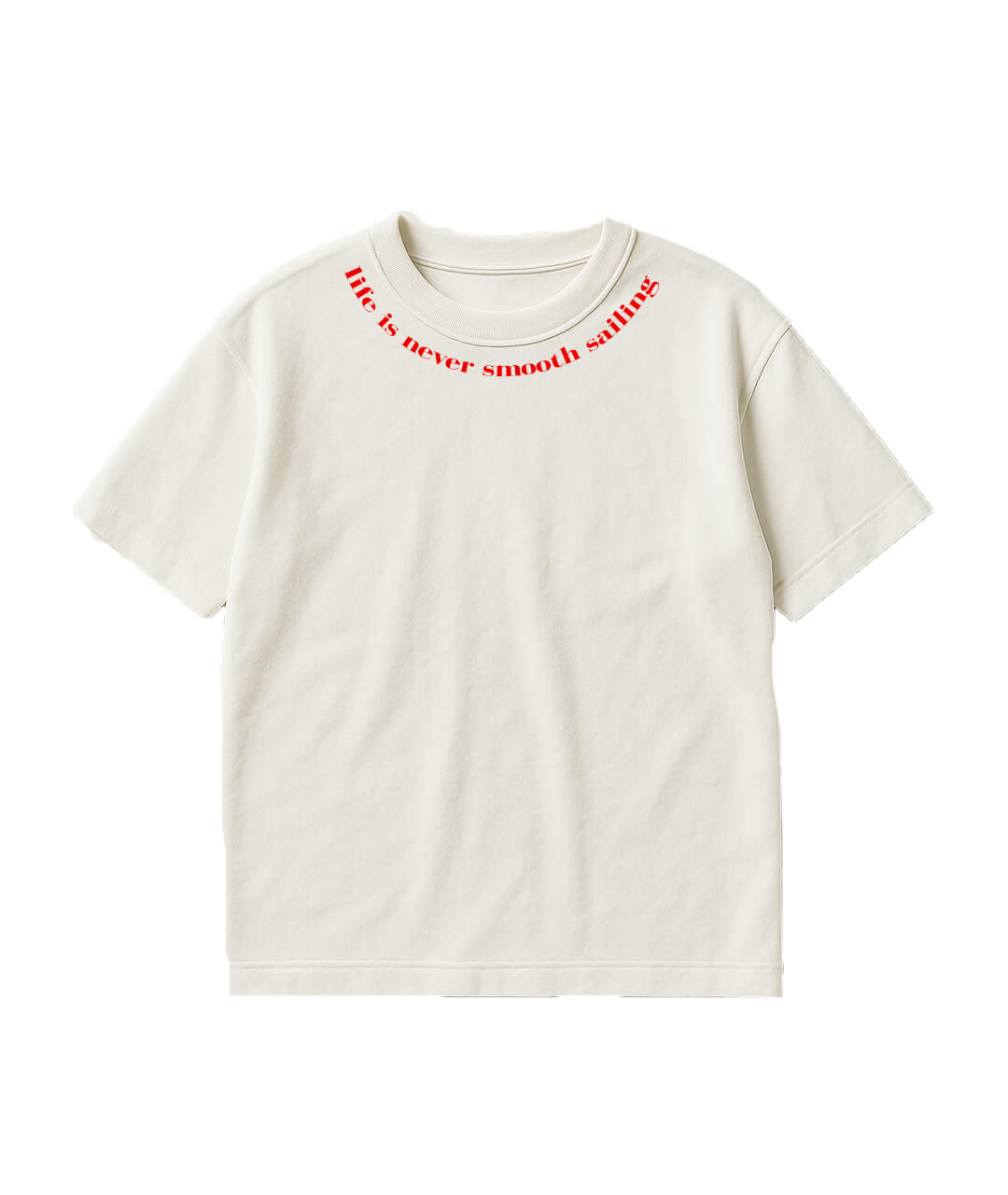 Clean, minimal, and quietly powerful—this Cotton Blend oversized t-shirt is designed for the ones who ride life’s waves with style. Featuring the phrase “life is never smooth sailing” along the collar and down the spine in bold red, it’s a reminder stitched in confidence and grit.