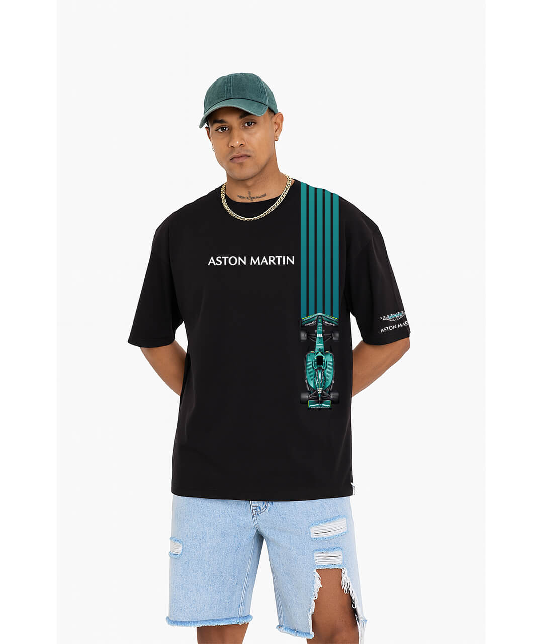 Crafted in premium cotton blend fabric, it offers a soft yet structured feel, perfect for everyday comfort. The boxy cut with drop shoulders creates a relaxed silhouette, while the teal racing stripes and car print add unmistakable Aston Martin identity.