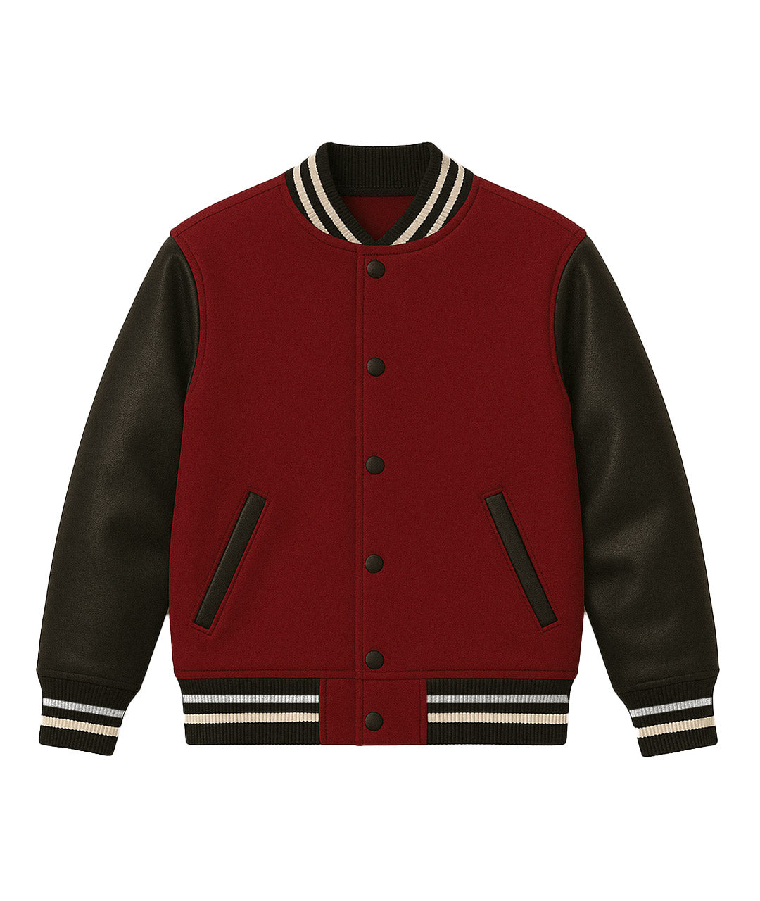 Engineered for those who live fast but dress sharper, the Maroon–Black Varsity is a heavyweight statement piece. With a deep maroon cotton fleece body balanced against jet-black leather sleeves, this jacket bridges motorsport aggression with timeless street culture. The ribbed cuffs and hem snap back to heritage varsity roots, while the oversized fit delivers modern streetwear energy.