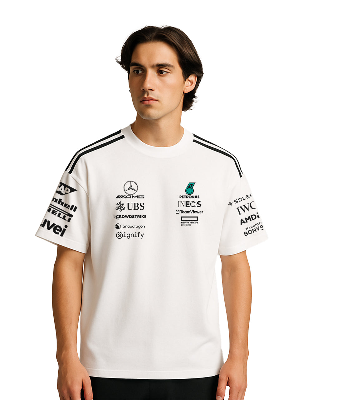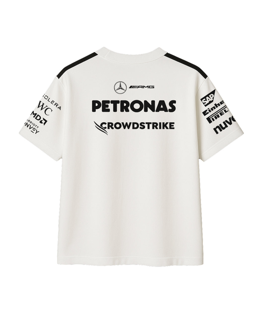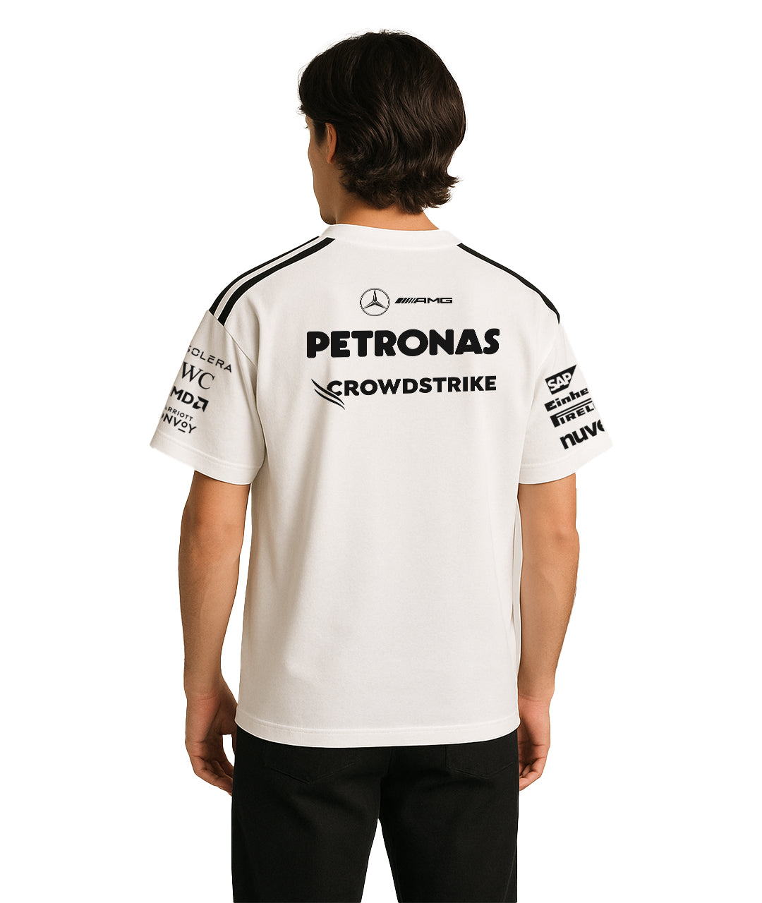 Built from the DNA of the 2025 Mercedes-AMG Petronas Formula 1 teamwear, this unisex oversized tee brings championship grit to everyday fits. Finished in a crisp white base with bold black accents, the tee is a nod to Mercedes' legacy of precision, power, and performance. Sponsor-inspired graphics stretch across the chest, sleeves, and back — echoing the energy of the paddock and the pulse of the racetrack.