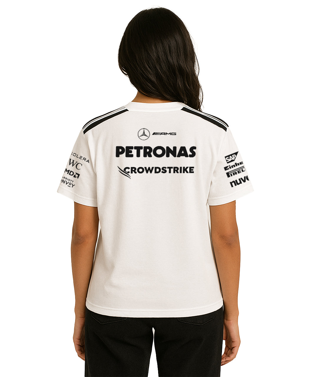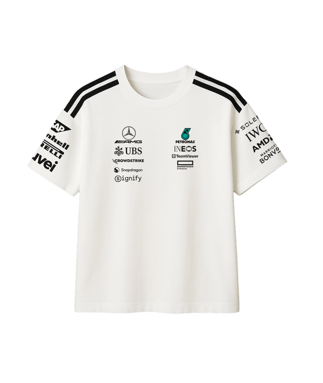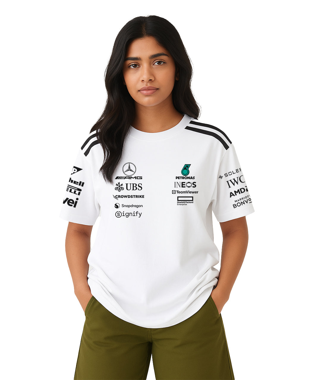 Built from the DNA of the 2025 Mercedes-AMG Petronas Formula 1 teamwear, this unisex oversized tee brings championship grit to everyday fits. Finished in a crisp white base with bold black accents, the tee is a nod to Mercedes' legacy of precision, power, and performance. Sponsor-inspired graphics stretch across the chest, sleeves, and back — echoing the energy of the paddock and the pulse of the racetrack.