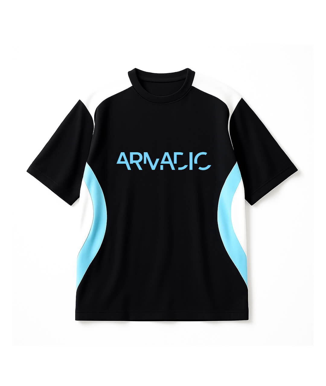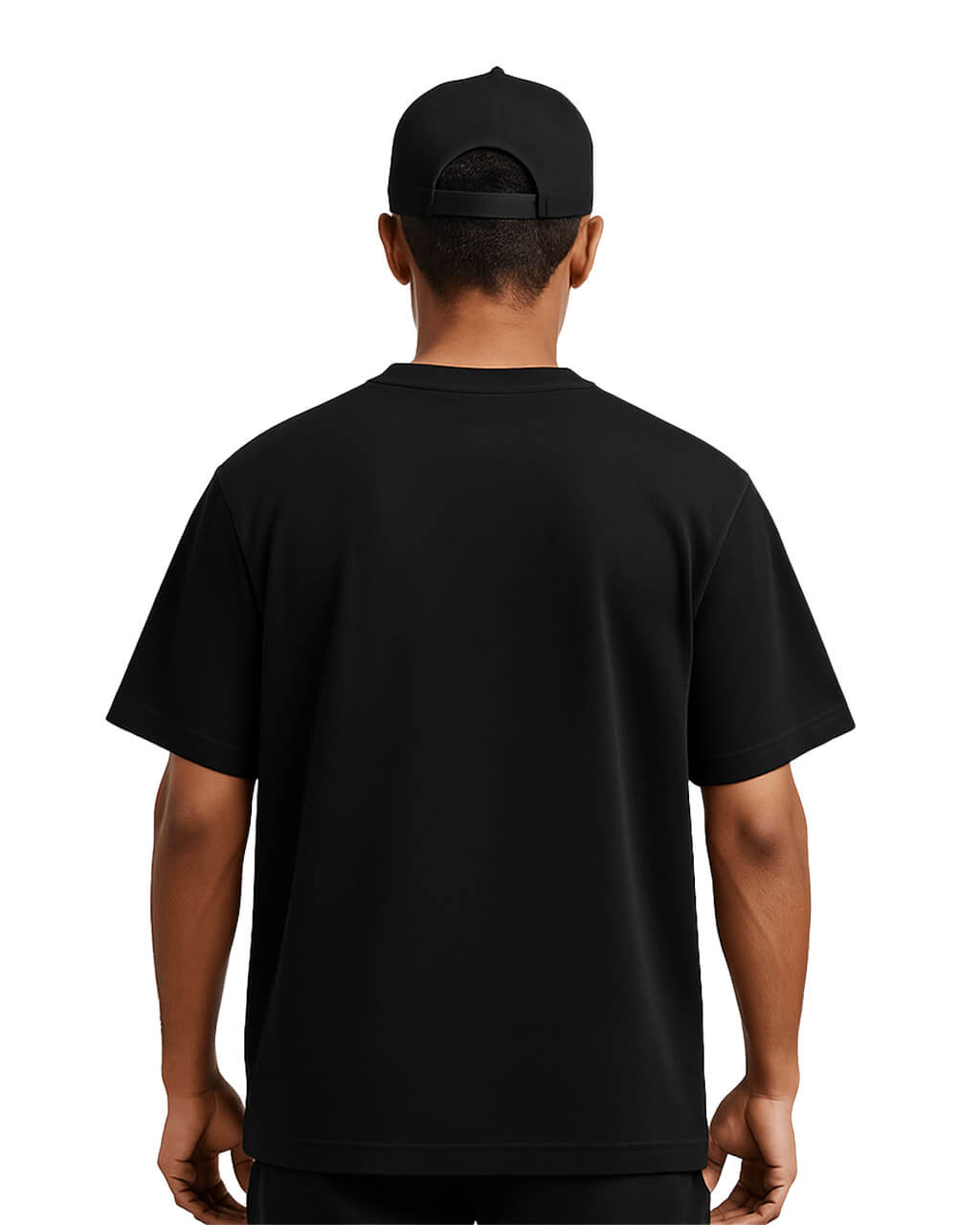 Featuring a black cotton base, accented with sky blue and white curved panels, this tee is a standout for campus fits, dance practices, or weekend city strolls. The oversized silhouette with elbow-length sleeves and drop shoulders gives it that perfect baggy look — unisex, easy to style, and made to be lived in.