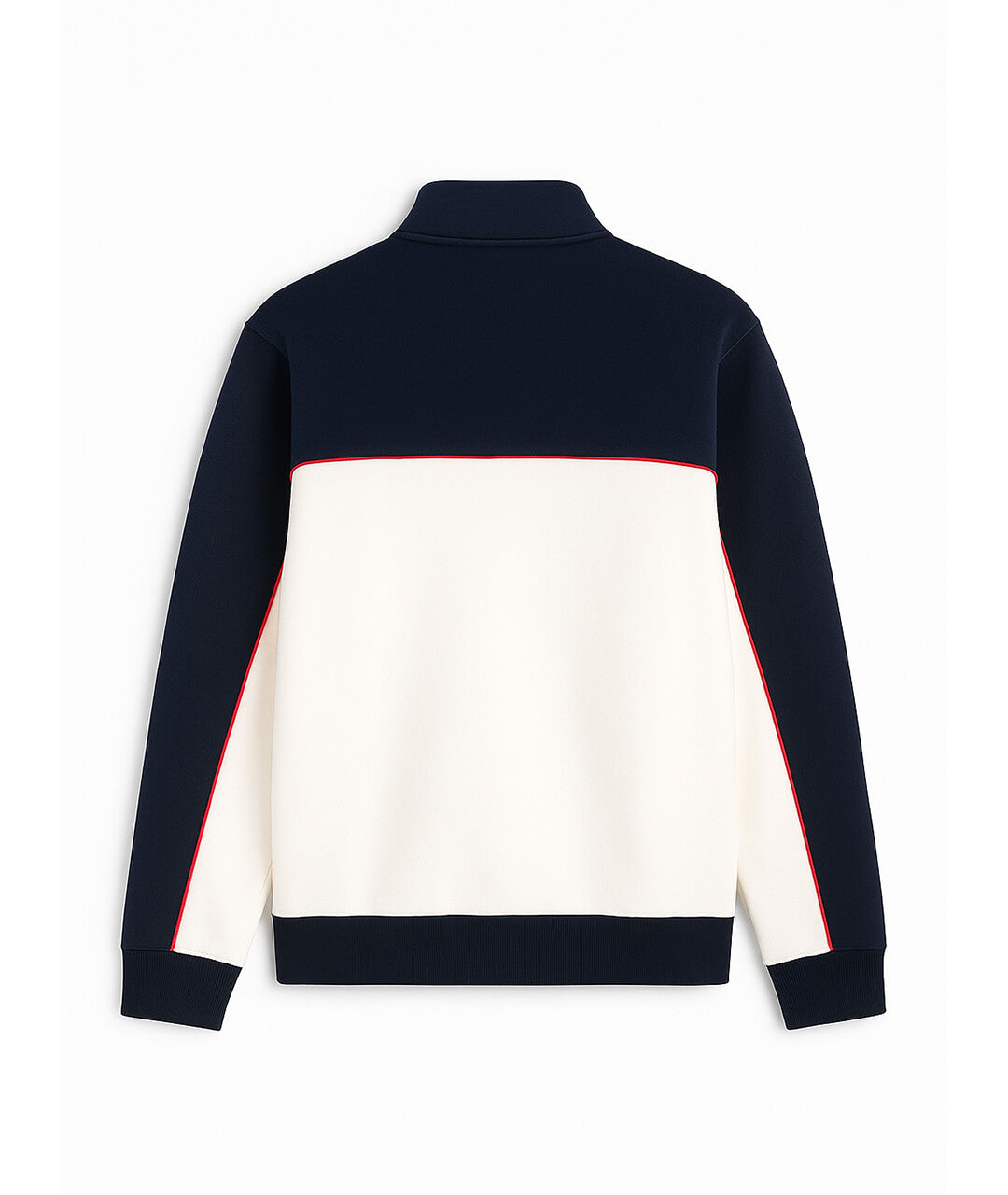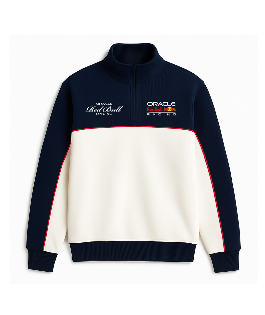 A clean, heritage-inspired take on Red Bull Racing’s trackside energy. This quarter-zip sweatshirt features a navy upper panel, cream body, and thin red piping for a striking motorsport edge. The official Red Bull Racing embroidery sits across the chest — precision-engineered for everyday wear.